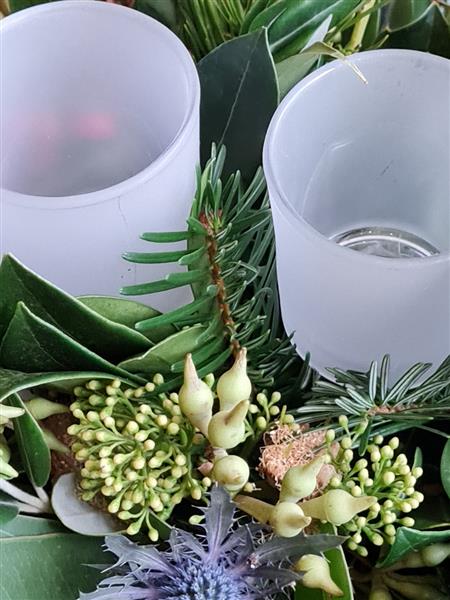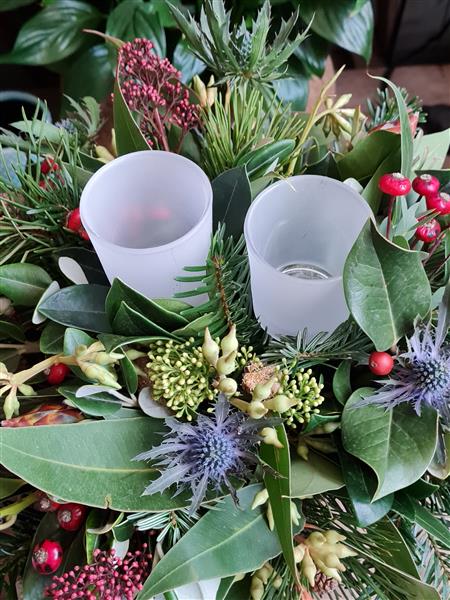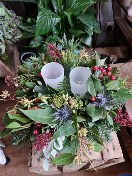 A Stunning table decoration packed with an abundance of winter foliages and berries in a rustic container, Bringing the outdoor in, long lasting and full of Christmas cheer, With Frosted glass tealight holders.