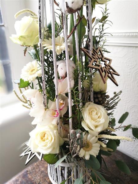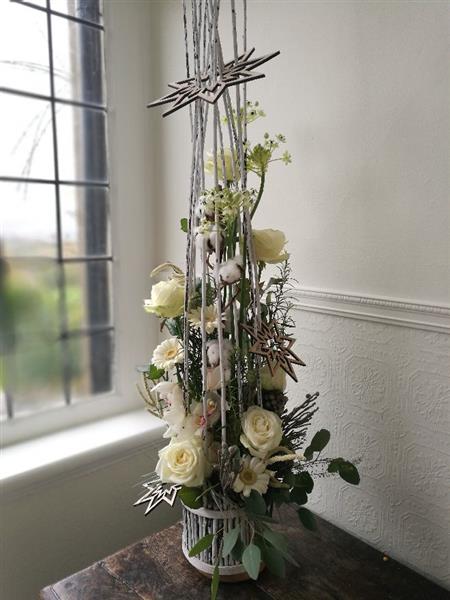 A stunning contemporary textured winter arrangement full of wonderful Roses, Orchids foliage's and textures. Celebrating the Winter season. Perfect gift for family or friends.